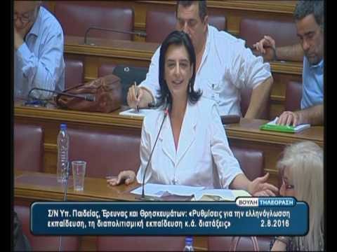 «Θα κάνω και εγώ κάποια σύντομα σχόλια για μερικές διατάξεις του νομοσχεδίου. Εξαιρετικά θετικές είναι οι διατάξεις που αφορούν την διαπολιτισμική εκπαίδευση, σε συνάρτηση με το σχέδιο δράσης που αφορά τους πρόσφυγες μαθητές και επειδή πριν από λίγο σε τούτη εδώ την αίθουσα ακούστηκαν και οι συνήθεις θλιβερές παραφωνίες, πρέπει να πούμε κάποια πράγματα. Μεσούσης της οικονομικής δυσπραγίας και της λιτότητας, ο ελληνικός λαός, ένας καθημαγμένος λαός, τον τελευταίο χρόνο έγινε φάρος δημοκρατίας, ελπίδας και φιλοξενίας στην Ευρώπη. Εμείς δεν ορθώσαμε φράχτες, δεν αντιμετωπίσαμε απέλπιδες ανθρώπους ως θυσιαστέους και αναλώσιμους, ούτε κάψαμε προσφυγικούς καταυλισμούς. Αντίθετα, πρώτιστο μέλημα παραμένει η ένταξη των προσφυγόπουλων στο εκπαιδευτικό μας σύστημα.